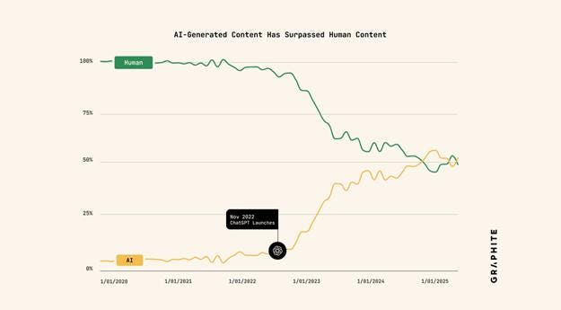 A Graphite study just found that AI-written articles briefly surpassed human-created ones on the web in late 2024, but the boom has since leveled off, with the web now split roughly evenly between human and AI authors.
