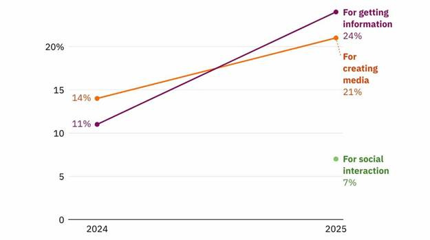 - Info seeking was reported as the new dominant use case, with 24% using AI for research and questions compared to 21% for generating text, images, or code.